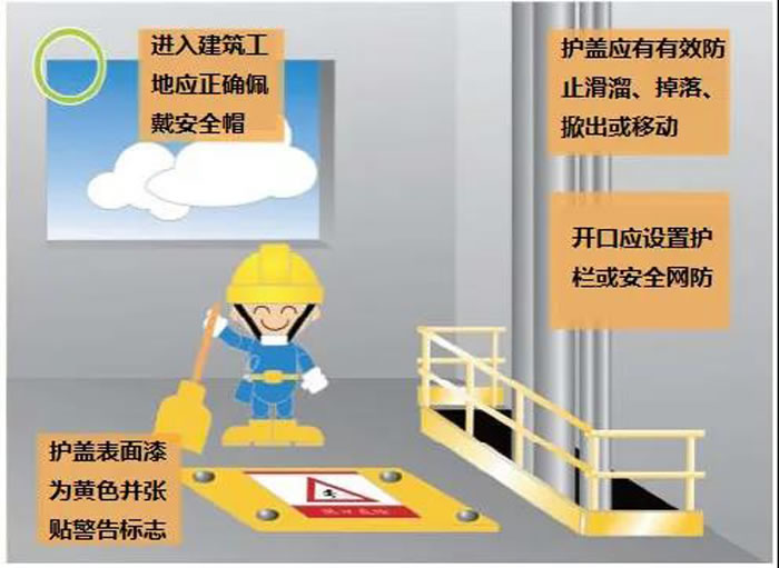 二、做好“四口"防護(hù):“四口”指樓梯口、電梯口、預(yù)留洞口和出入口(也稱通道口)。