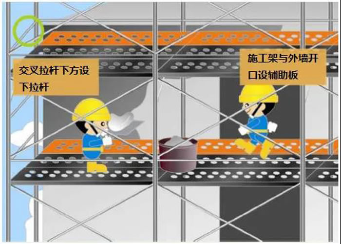 (3)設(shè)置安全網(wǎng)。凡無(wú)外架防護(hù)作業(yè)點(diǎn),必須在離地4m高處搭設(shè)固定的安全平網(wǎng),高層施工還應(yīng)隔四層再安一道固定的安全平網(wǎng),并同時(shí)設(shè)一層隨墻體逐層上升的安全平網(wǎng)。